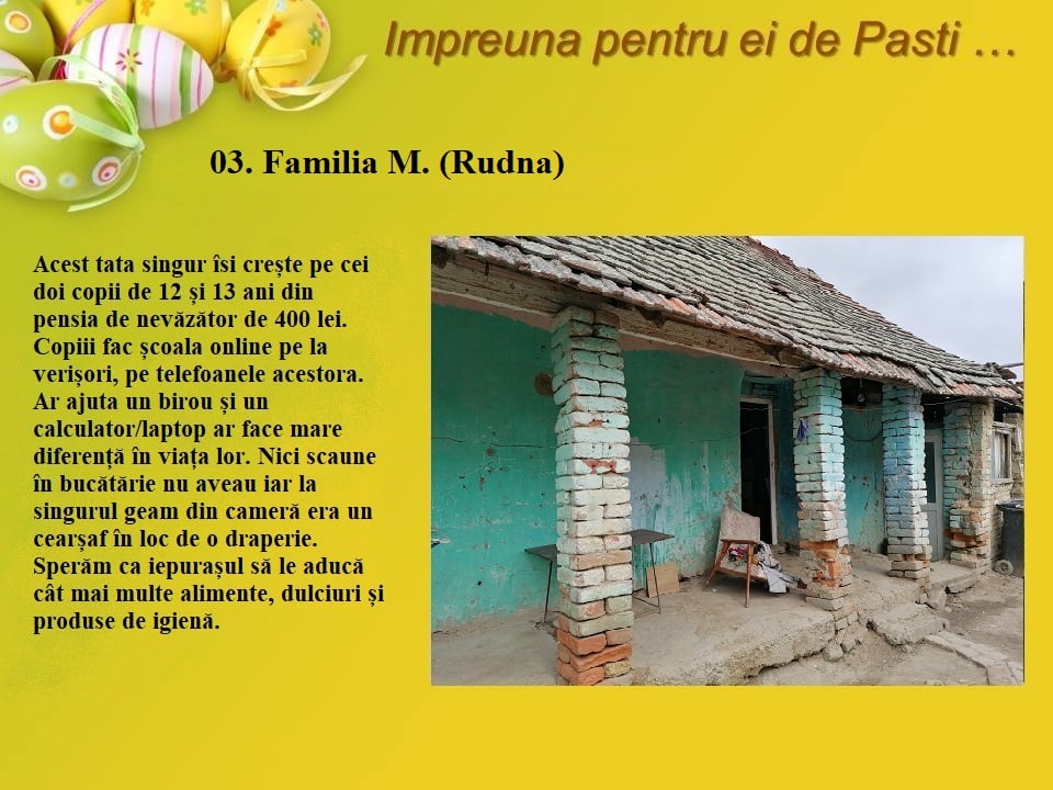 Proiectul „Împreună pentru ei de Paști”, realizat de Look Inside se află deja la a IX-a ediție. Vă poartă prin Rudna și Crai Nou, două sate în care 31 de familii au nevoie de ajutorul vostru, pentru a trece mai ușor perioada sărbătorilor de Paști.