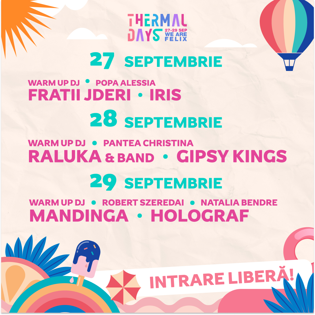 Astfel, organizatorii va așteaptă în BĂILE FELIX (parcarea mare de la intrarea în stațiune) între 27-29 septembrie, începând cu ora 16:00 până la miezul nopții. Vizitatorii vor avea parte de un program diversificat, care promite să satisfacă toate gusturile și multe surprize. Organizatorii vă îndeamnă să vă lăsați purtați de atmosfera vibrantă creată și de ceilalți artiști de renume care vor fi prezenți pe scenă, printre care IRIS, HOLOGRAF, MANDINGA, RALUKA & BAND, FRAȚII JDERI, CHRISTINA PANTEA și RADIO HYPE. Muzica live va transforma nopțile calde de toamnă în momente memorabile!
