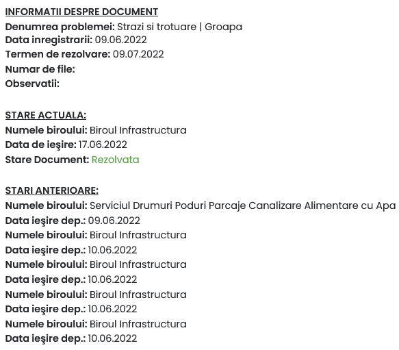 Aceasta este ultima sesizare. La verificarea statusului acesteia, obțin următorul rezultat: