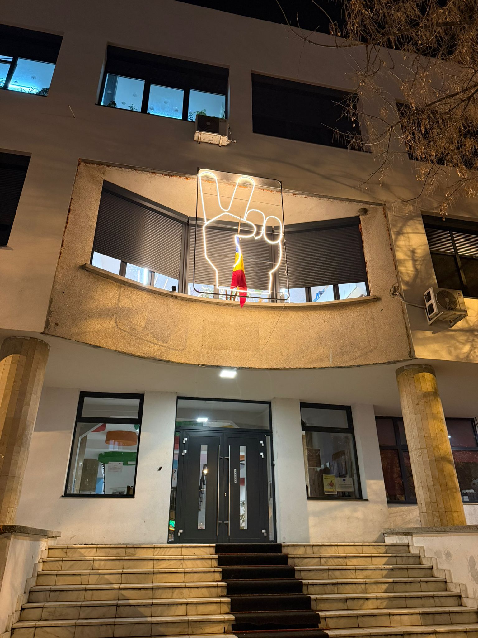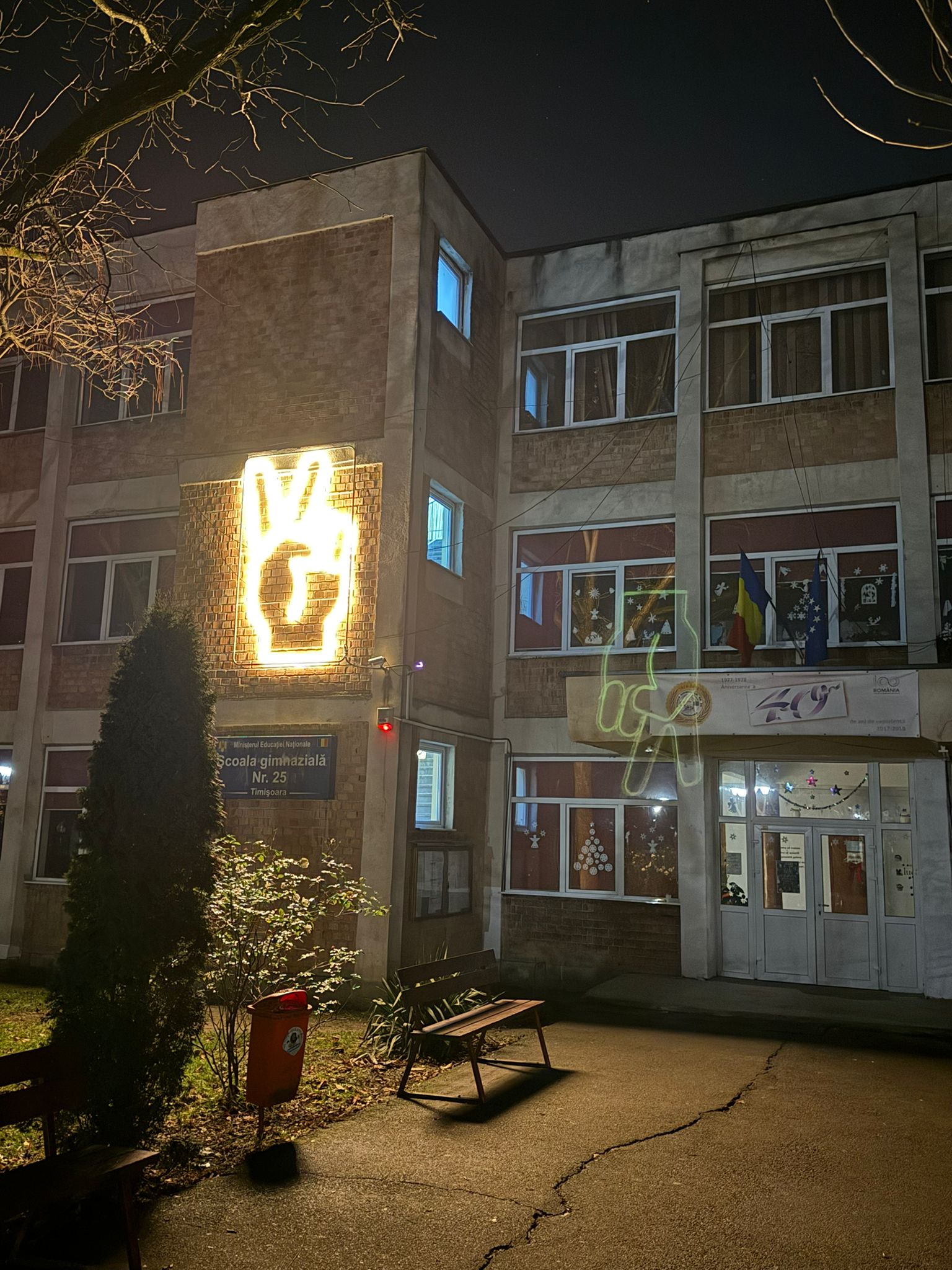 Primăria Timișoara a montat instalații luminoase care reprezintă semnul victoriei, deja consacrat ca identitate vizuală pentru Revoluție, pe clădirile a 19 școli din oraș.
