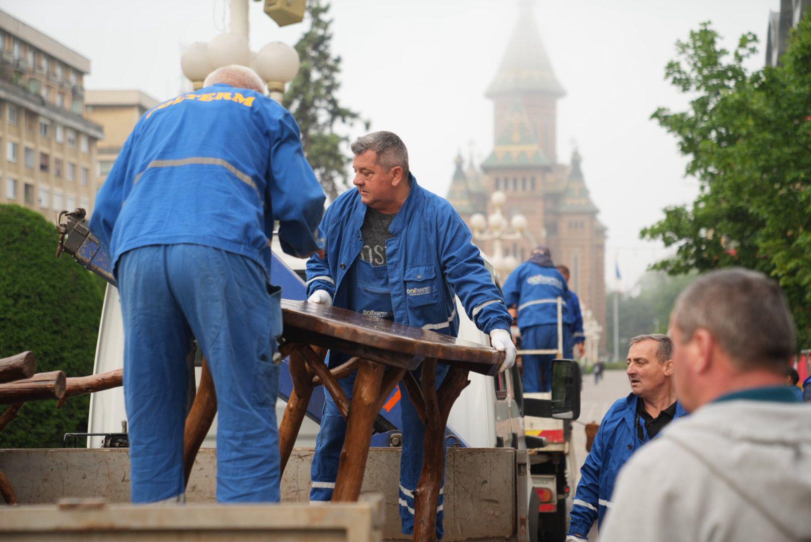 Joi, 8 mai, încă de la prima oră, echipajele primăriei au ajuns în Piața Victoriei pentru a ridica mesele, scaunele și celelalte obiecte de mobilier amplasate pe domeniul public de proprietarii teraselor neautorizate.
