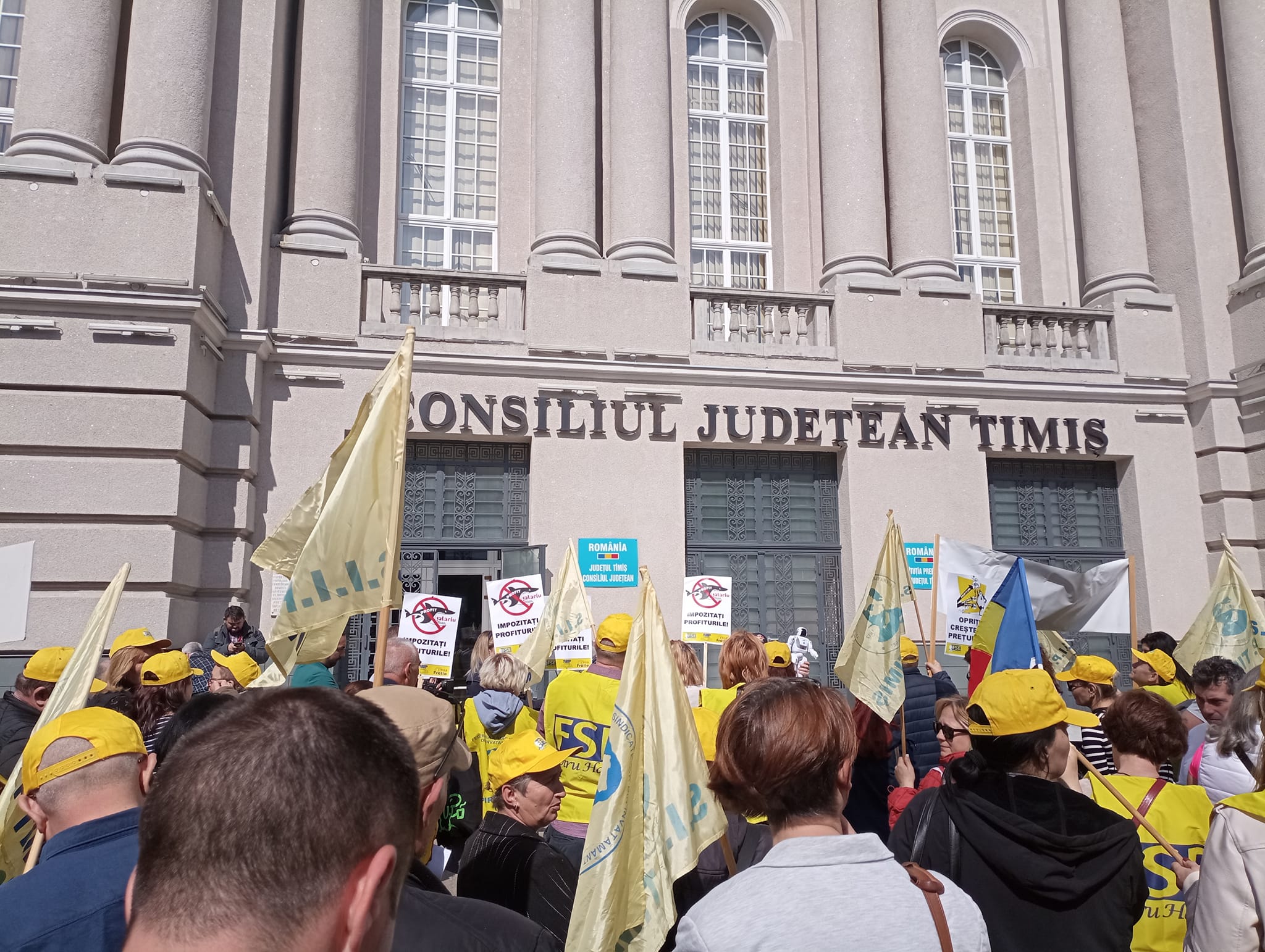 Joi, în fața Prefecturii Timiș, zeci de cadre didactice din învățământul preuniversitar, membri ai Sindicatului „Spiru Haret” au scandat și au afișat lozinci precum: „Majorați salariile”, Opriți creșterea prețurilor”, „Grevă” sau „Vrem salarii decente”.