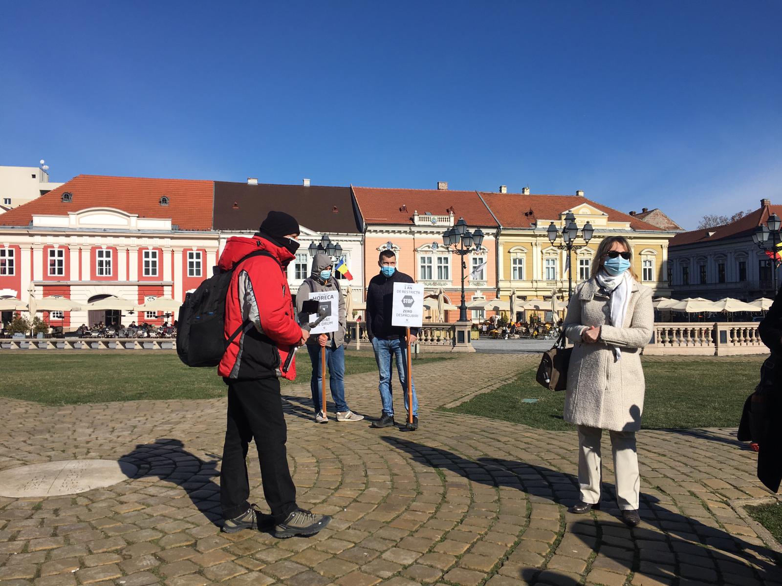 „Suntem aici să protestăm vizavi de restricționarea industriei noastre. Suntem închiși a doua oară și vrem ca acest lucru să înceteze. Vrem să se elibereze fondurile de ajutor de care avem nevoie pentru un nou restart și vrem să fim deschiși măcar cu 30% din capacitate, indiferent de numărul de infectare. Nu e corect să fim singura industrie restricționată – mergem la mall și vedem lume, în fabrici lumea lucrează cot la cot opt ore pe zi. În restaurant oamenii socializează în medie o oră și jumătate”, ne-a spus Rodica, administrator de restaurant.