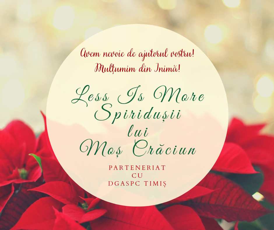 „Şi în acest an am ales să fim alături copiilor din centre şi case de tip familial aflate în structura Direcţiei Generale de Asistenţă Socială şi Protecţia Copilului Timiş, loc unde ne-am făcut prieteni copiii cărora le-am oferit daruri şi anul trecut. Anul acesta ne-am propus să pregătim 250 de cadouri, pe care le vom oferi acestor copii şi tineri şi, pentru ca bucuria să fie deplină, ne-am gândit să pregătim şi câte un brăduţ cu ornamente (15 bucăți) pentru fiecare loc în care vor ajunge darurile noastre”, a transmis Ema Peregi, coordonatoare Less is more.