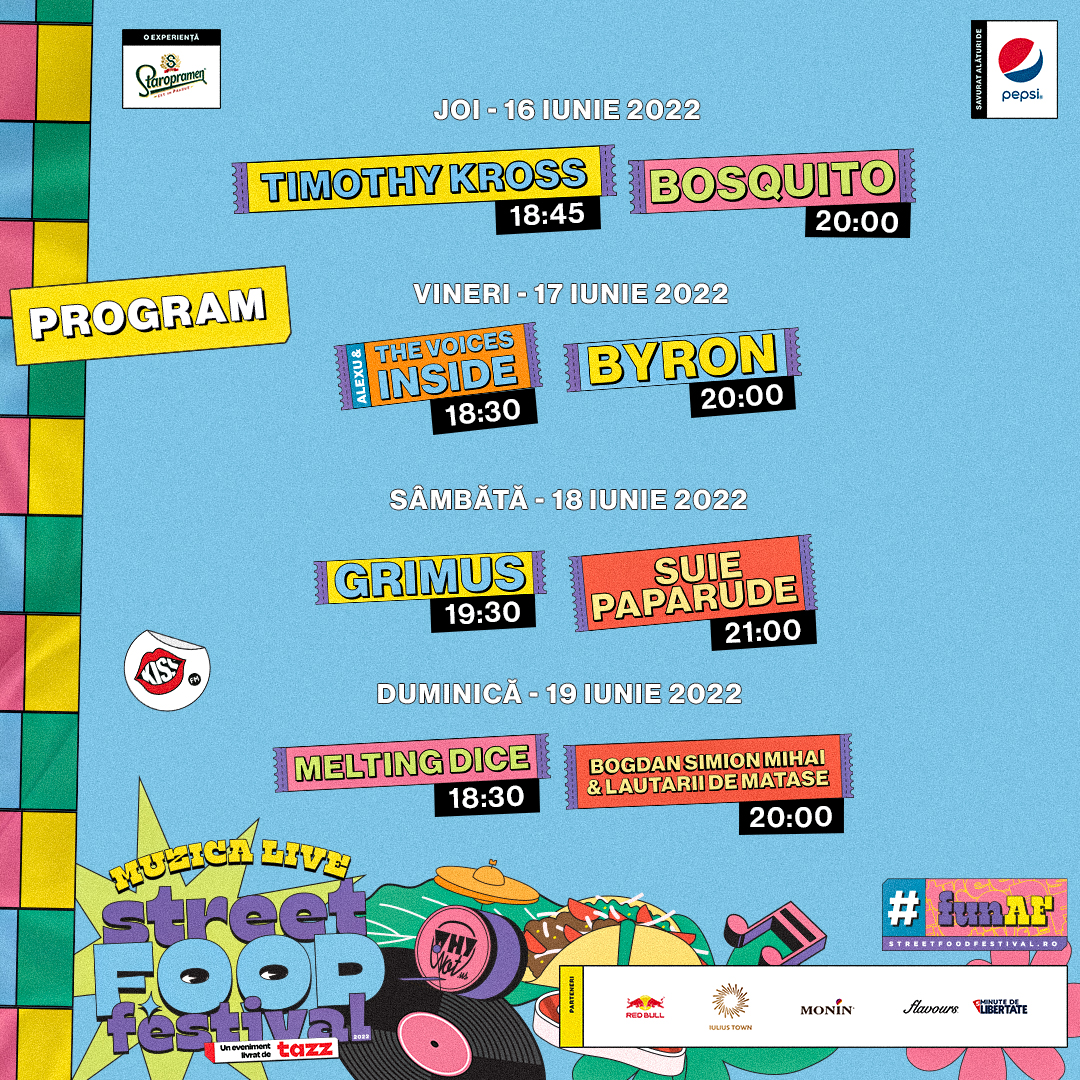 După atâta mâncare bună, este vremea să ne dansăm! Joi, de la ora 18:45, te aşteaptă Timothy Kross, iar de la ora 20:00, Bosquito va face show. Vineri, de la ora 18:30, pe scenă va urca Alexu and The Voices Inside, urmaţi de Byron, la 20:00. Sâmbătă, de la ora 19:30, este rândul celor de la Grimus să vă încânte, iar de la ora 21:00, vibe-ul şi energia marca Șuie Paparude vor pune stâpânire pe Iulius Gardens. Duminică, Melting Dice va urca pe scenă de la ora 18:30, iar show-ul de final îi va aparţine lui Bogdan Simion Mihai & Lăutarii de Mătase, de la ora 20.00.