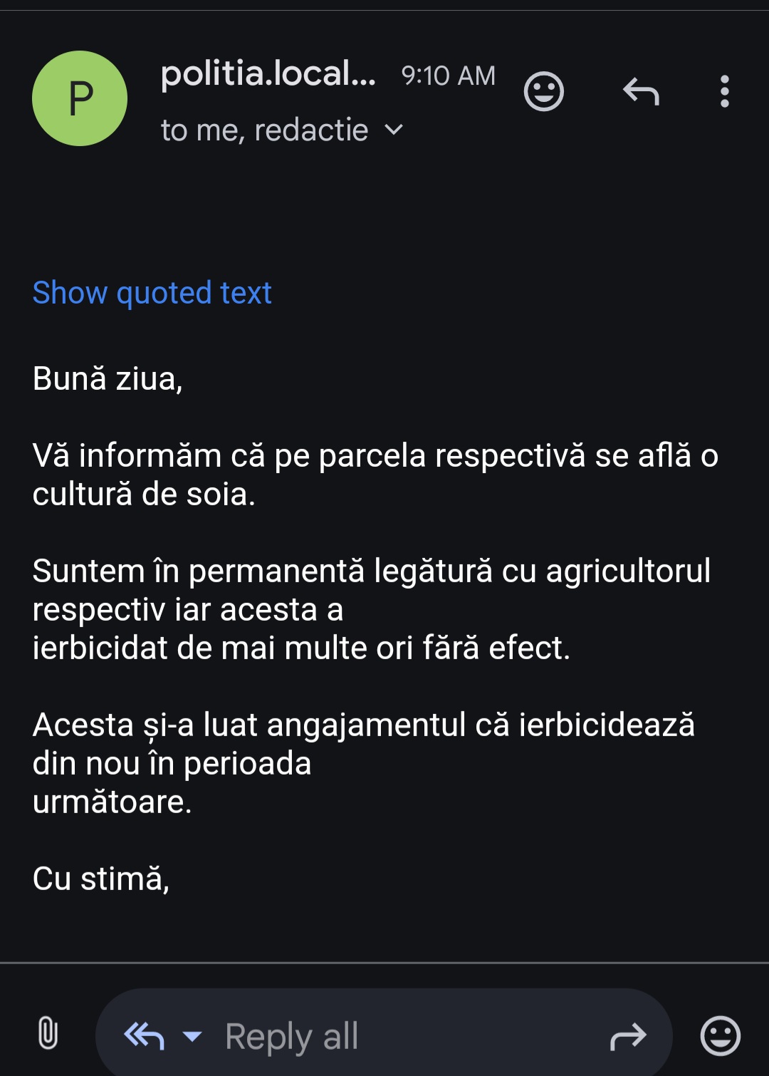 Între timp, cititorul care ne-a sesizat situația a primit și un răspuns din partea Poliției Locale Ghiroda. Potrivit acestuia, pe terenul în cauză se află o plantație de soia, iar proprietarul a ierbicidat în mai multe rânduri, fără rezolvare. În acest răspuns nu se menționează nimic în legătură cu somația sau eventuala amendă.