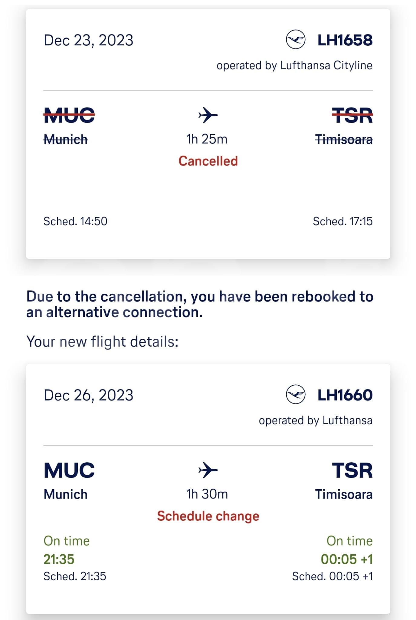 Potrivit datelor de pe portalul FlightStats, zeci de zboruri operate de Lufthansa CityLine – subsidiarul care avea și zborul către Timișoara de pe 23 decembrie – și alte câteva ale companiei- mamă de pe aeroportul din München au fost anulate pe 22 și 23 decembrie. Printre altele, avem în aceeași situație zboruri către Miami, Bruxelles, Belgrad, Münster, Zürich, Copenhaga, Dusseldörf, Nice, Berlin, Geneva, Genova, Stuttgart, Bilbao, Birmingham, Viena, Hannover, Graz sau Lyon.