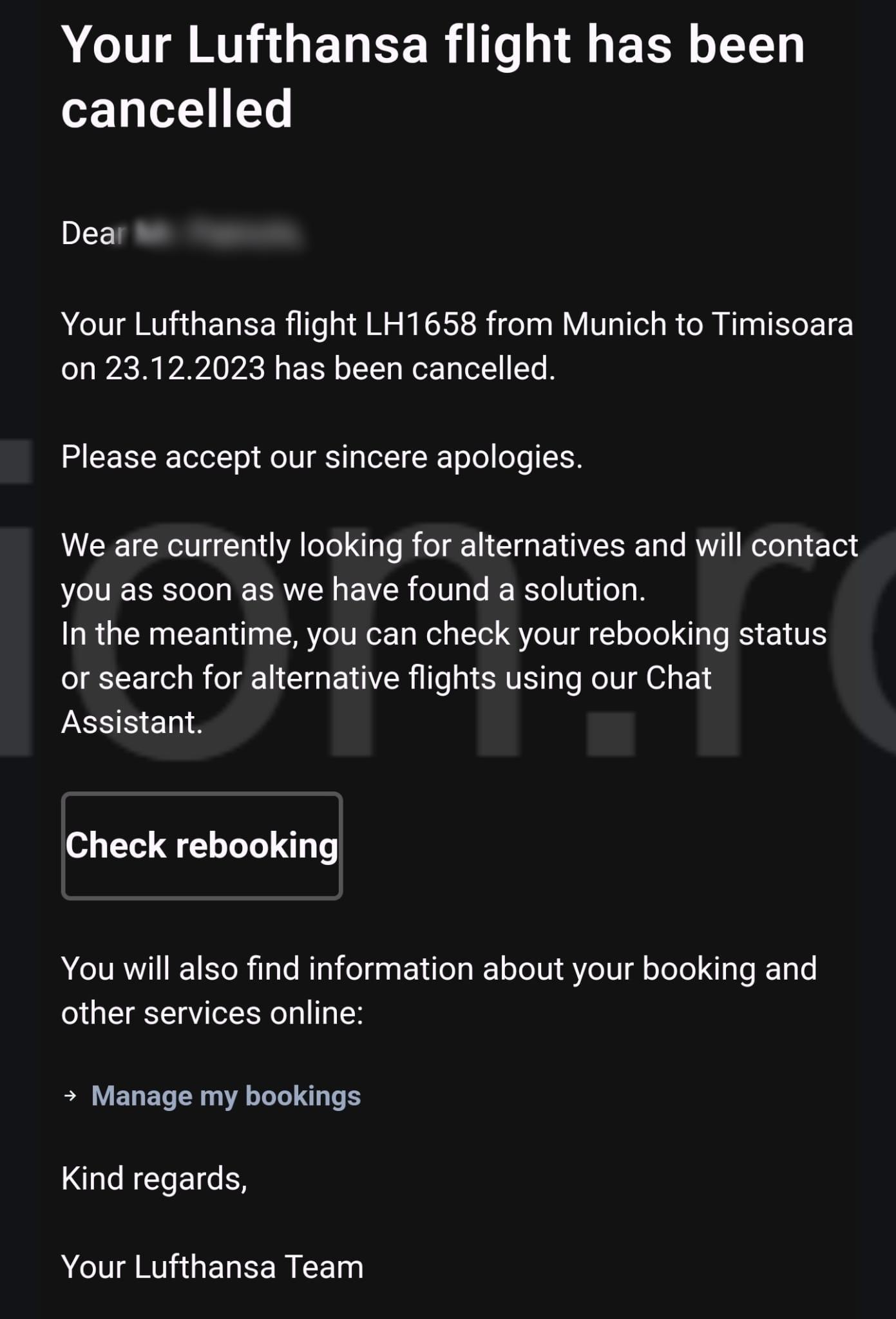 Fiul cititorului ne-a dat și mai multe detalii. Potrivit acestuia, pe aeroport s-au trezit în aceeași situație și pasagerii altor zboruri operate de Lufthansa. Au primit doar un e-mail de la companie, pentru ca mai apoi să aibă de ales între două opțiuni: schimbarea zborului, cu cazare la hotel până la decolare, sau rambursarea valorii biletului. Acesta a prins un loc doar pentru zborul de marți, 26 decembrie.