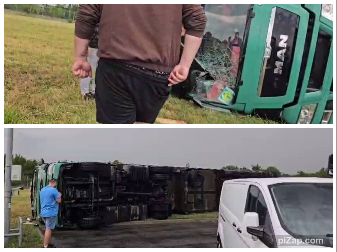 FOTO. Tir răsturnat de vânt, la Lugoj