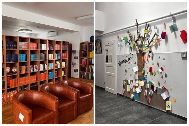 Tot aici funcționează și o bibliotecă, cu angajat bibliotecar, cu cărți noi, cumpărate recent. Astfel, copiii pot veni să împrumute cărți, pe care să le citească acasă, sau le vor putea răsfoi în sala de lectură care urmează să fie mobilată. În vechea școală, biblioteca se desființase din lipsă de spațiu. Elevii au și un sistem audio pentru radioul școlii, de unde vor putea emite diverse mesaje, anunțuri, melodii etc.