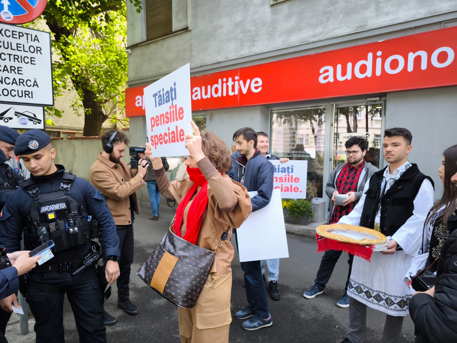 Protestatarii, nici 10 la număr, au ridicat pancarte cu „Tăiați pensiile speciale” și spun că guvernanții întorc spatele timișorenilor.