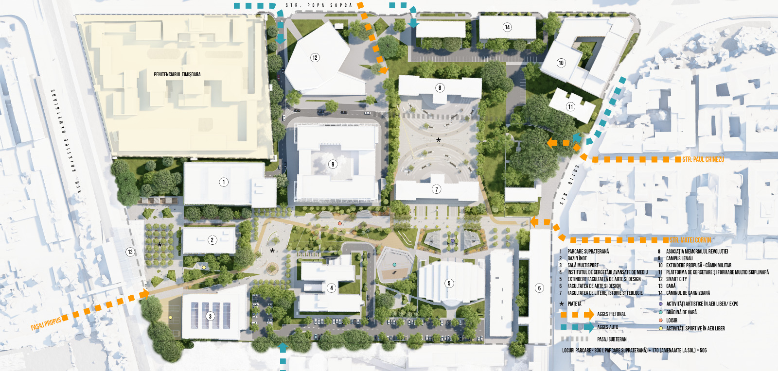 Documentația a fost întocmită de AGORAPOLIS SRL pentru 179.999 de lei cu TVA – puțin peste 36.000 de euro. Proiectul este realizat cu fonduri de la bugetul local, în parteneriat cu Universitatea de Vest din Timișoara, cea care deține cele mai multe dintre terenurile vizate.