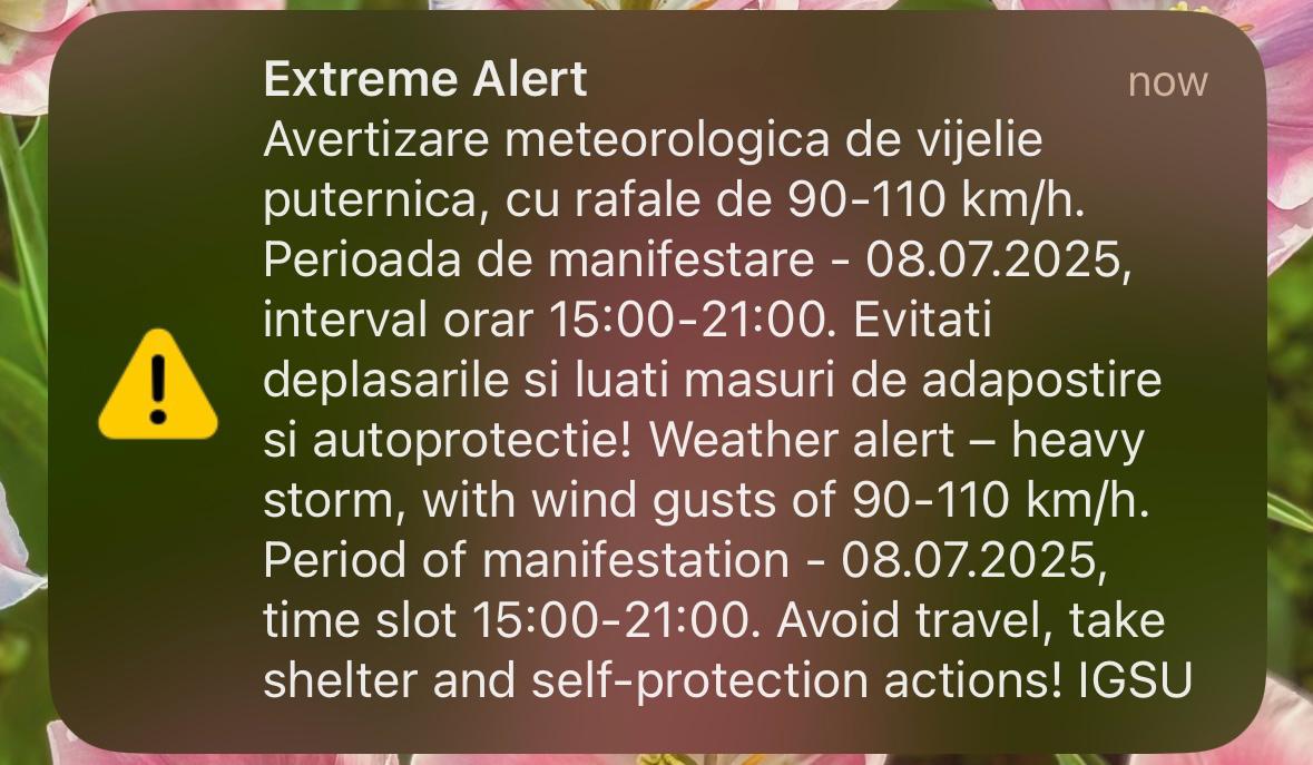 UPDATE 2. Încă o avertizare RO-Alert emisă până la ora 17