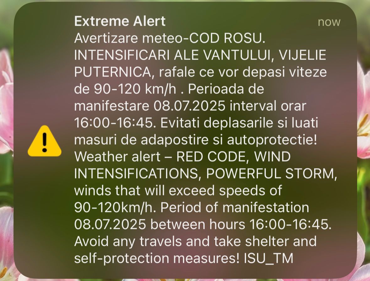 ANM a emis o avertizare Cod Roșu de vijelii puternice, valabilă astăzi de la ora 15 și până la ora 21. Zonele vizate sunt județele Timiș, Caraș-Severin, Arad, Bihor, Satu Mare, Sălaj, Maramureș, Cluj, Alba și Hunedoara, unde sunt așteptate rafale de 90-110 km/h.