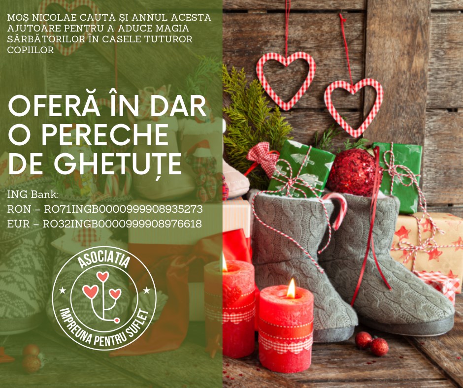 „Doar datorită vouă, celor care ne-ați fost alături în acești ani, am reușit împreună să aducem bucurie și speranță celor aflați în nevoie. Astăzi vorbim despre campania «Oferă în dar o pereche de ghetuțe» prin care dorim să ajutăm peste 50 de copii cu o pereche nouă de ghetuțe pe care să le poată lustrui și pregăti în așteptarea lui Moș Nicolae. Toți cei care doresc să lumineze sărbătorile de iarnă unor copii care provin din familii defavorizate sunt invitați să se alăture inițiativei”, spun cei de la Asociația Împreună pentru Suflet pe Facebook.