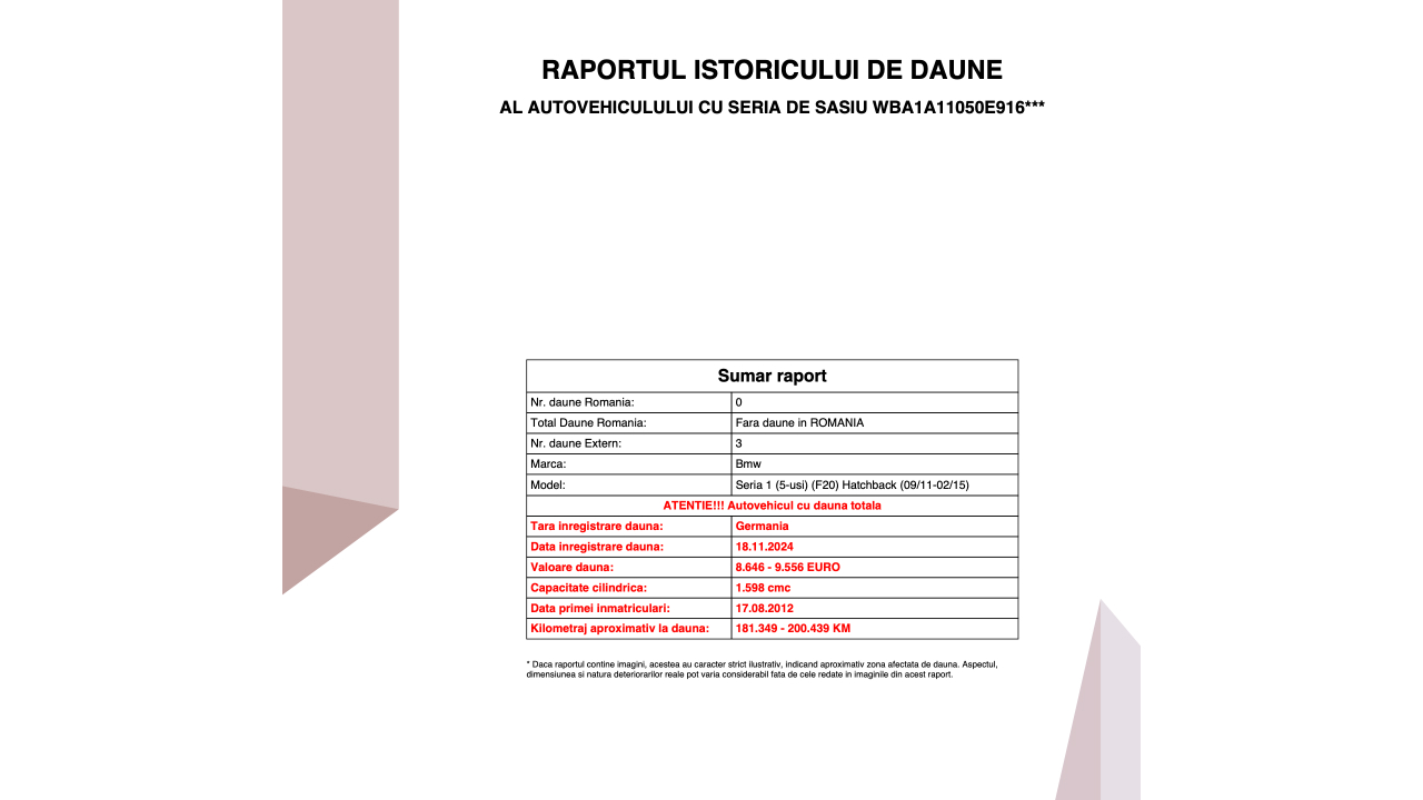 Pentru a evita surprizele, poți apela la un serviciu specializat, cum este AiDaune.ro. Platforma oferă rapoarte detaliate despre trecutul mașinii, pe baza seriei VIN.