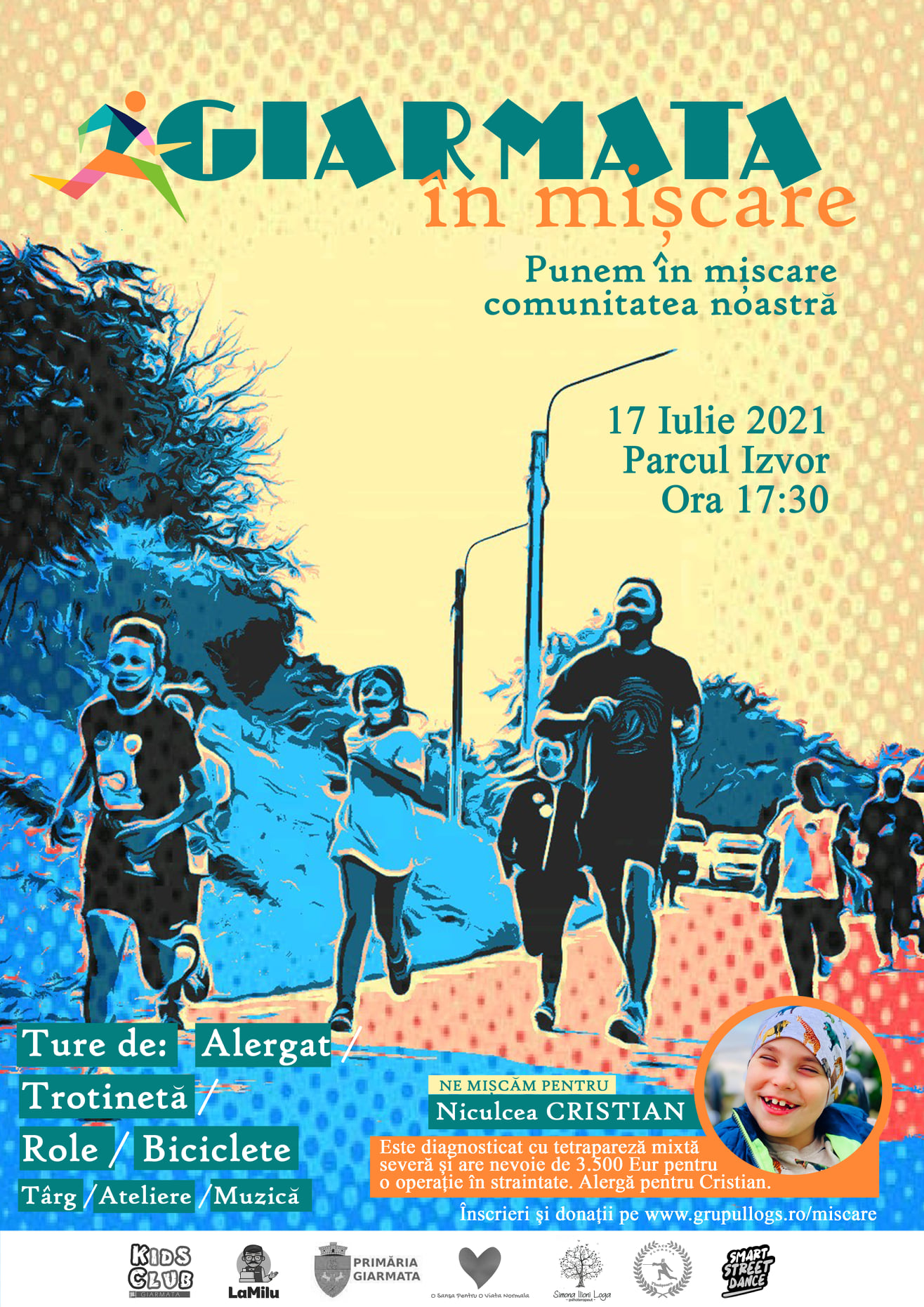 Sâmbătă, 17 iulie, în Parcul Izvor din Giarmata se vor organiza curse, dar și ateliere pentru a strânge bani pentru Niculcea Cristian, un băiețel din Giarmata diagnosticat cu tetrapareză mixtă severă și care are nevoie de 3.500 de euro pentru o operație în străinătate.