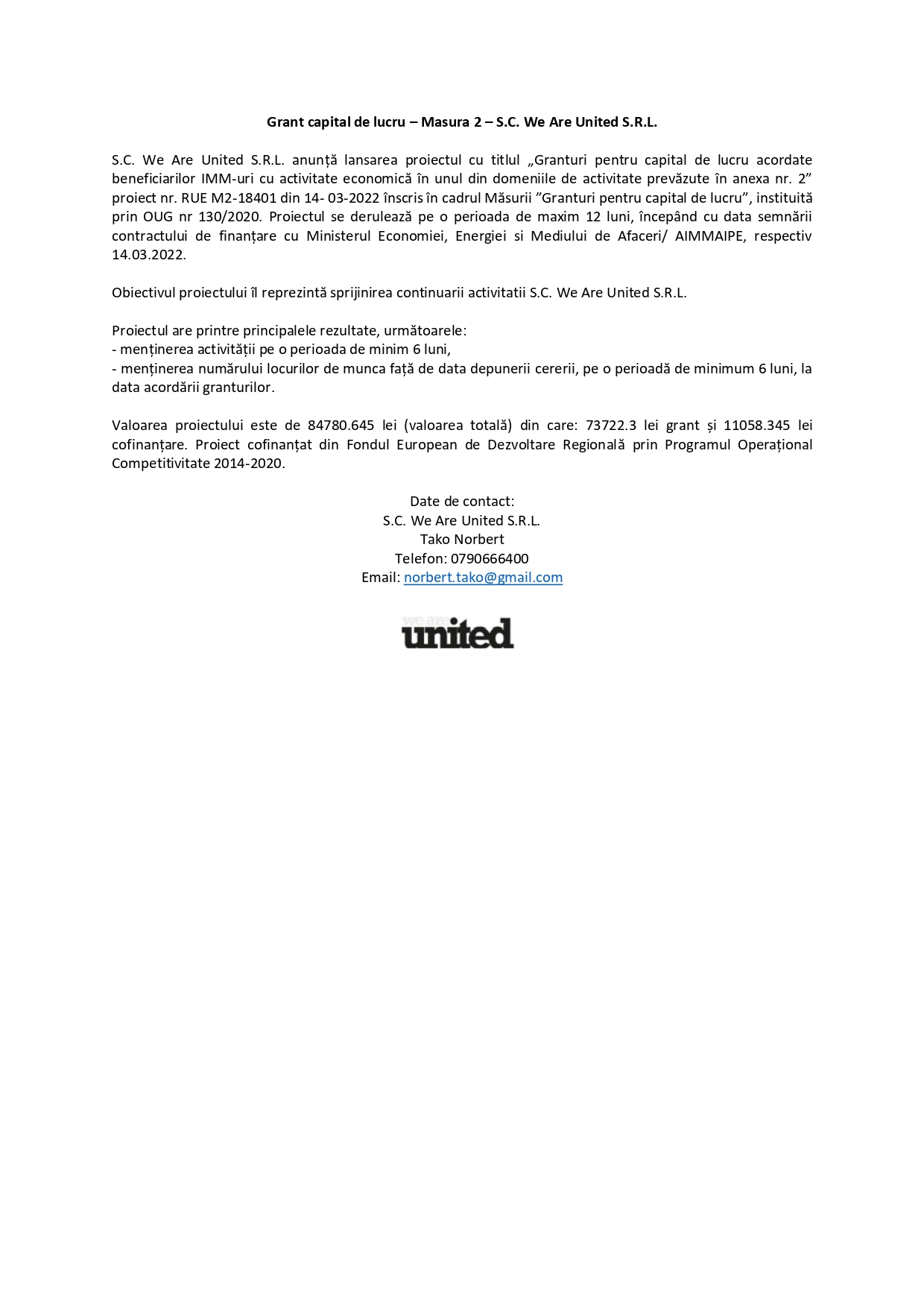 S.C. We Are United S.R.L. anunță lansarea proiectul cu titlul „Granturi pentru capital de lucru acordate beneficiarilor IMM-uri cu activitate economică în unul din domeniile de activitate prevăzute în anexa nr. 2” proiect nr. RUE M2-18401 din 14- 03-2022 înscris în cadrul Măsurii „Granturi pentru capital de lucru”, instituită prin OUG nr 130/2020. Proiectul se derulează pe o perioada de maxim 12 luni, începând cu data semnării contractului de finanțare cu Ministerul Economiei, Energiei si Mediului de Afaceri/ AIMMAIPE, respectiv 14.03.2022.