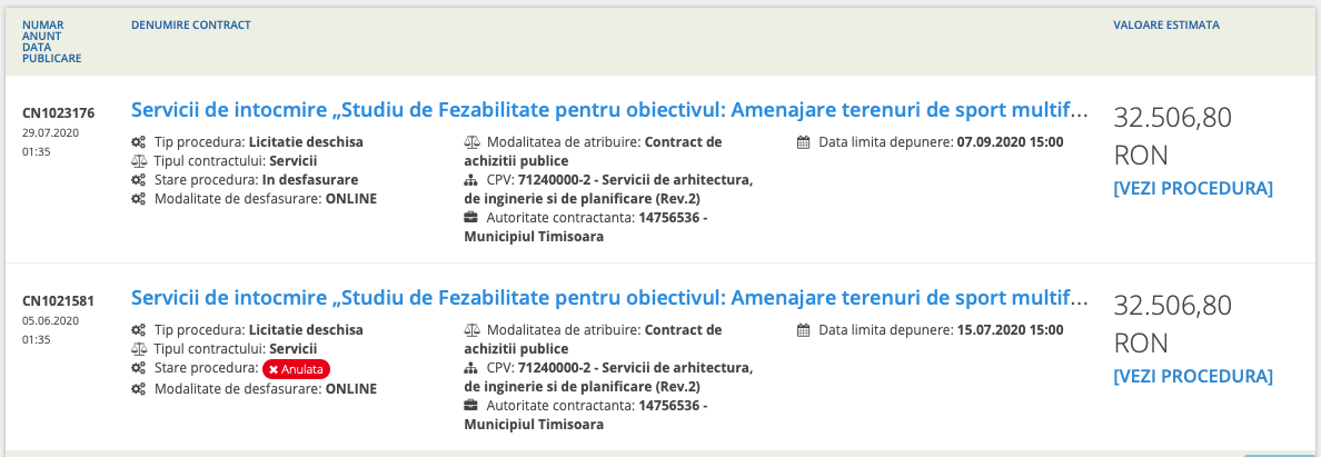 Prima licitație a fost demarată în luna iunie a acestui an, când primăria punea la bătaie suma de 38.682 de lei pentru proiectare. Procedura a fost anulată, pentru că până la data limită, 15 iulie, „au fost depuse numai oferte inacceptabile și/sau neconforme” și nu a fost depusă o „ofertă admisibilă”.