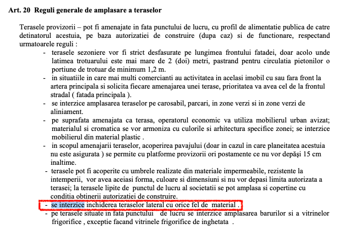 Aaha, interdicția presupun ca avea in vedere sa preintampine variante de inchidere a teraselor in mod inestetic. Oricum cata vreme e pandemie nu ar trebui sa existe acele igluu-uri care favorizeaza transmiterea virusilor ca de altfel iesitul la terasa care nu e neaparat necesar.