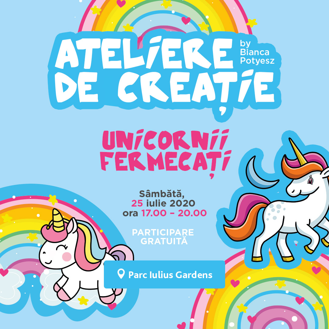 Sâmbătă, de la ora 17.00, prichindeii sunt așteptați la un atelier de creație. Micii meșteri vor demonstra cât sunt de talentați și vor crea unicorni fermecați. Iar duminică, 26 iulie, în parcul Iulius Gardens va avea loc teatru de păpuși. „Magazinul Fermecat” îi va face pe copii să pătrundă într-o lume magică, unde totul este posibil. Accesul este gratuit și se face în limita locurilor disponibile.