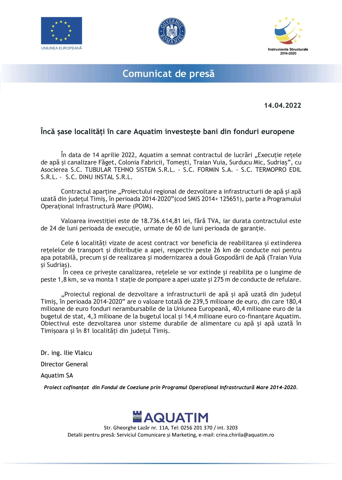 În data de 14 aprilie 2022, Aquatim a semnat contractul de lucrări „Execuție rețele de apă și canalizare Făget, Colonia Fabricii, Tomești, Traian Vuia, Surducu Mic, Sudriaș”, cu Asocierea S.C. TUBULAR TEHNO SISTEM S.R.L. – S.C. FORMIN S.A. – S.C. TERMOPRO EDIL S.R.L. – S.C. DINU INSTAL S.R.L.