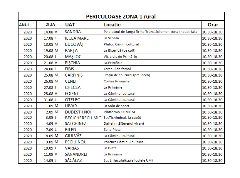 Cetățenii pot depune prin aport voluntar deșeurile periculoase în containerele special puse la dispoziție în punctele de colectare și între orele menționate în tabelul alăturat.