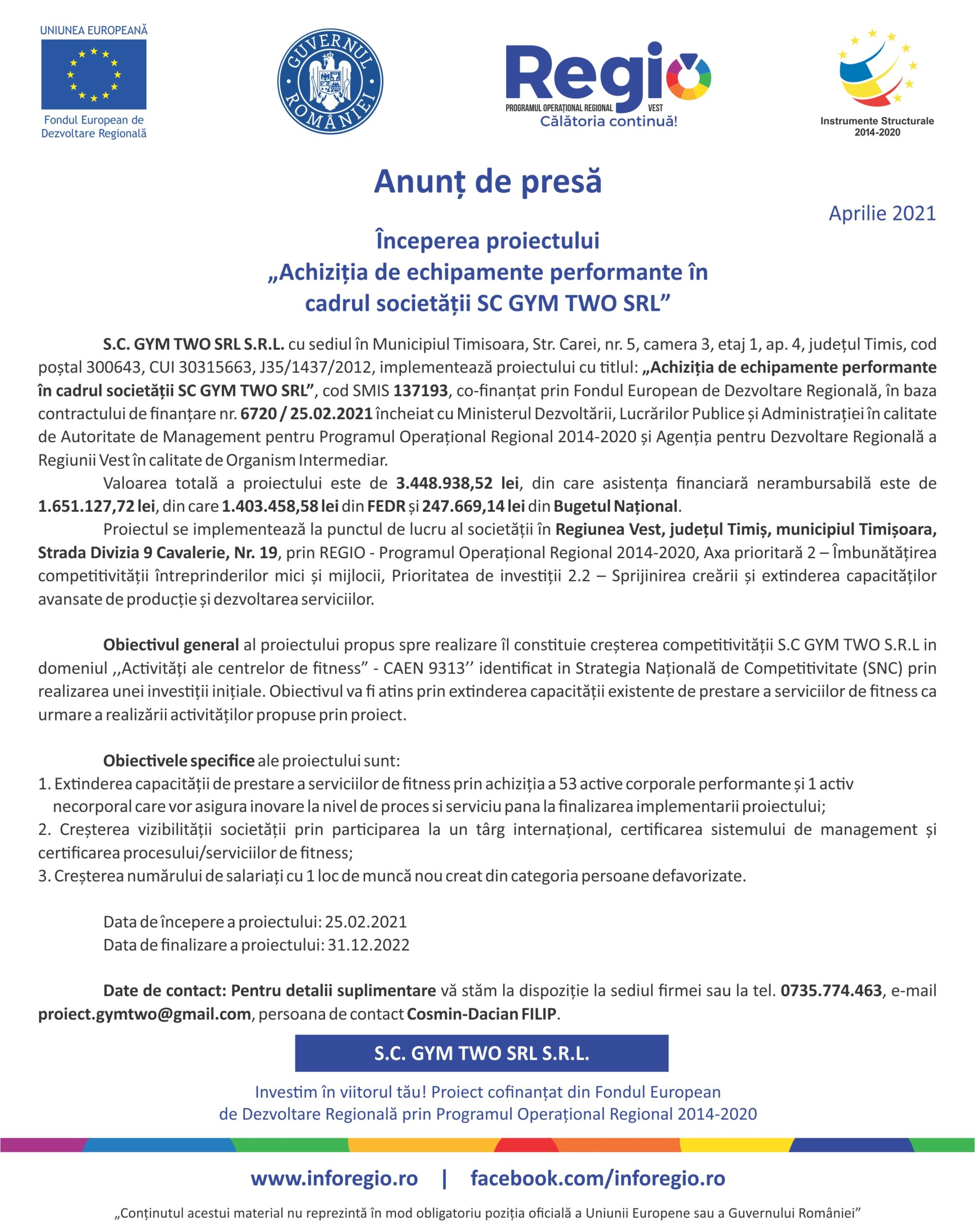 Date de contact: Pentru detalii suplimentare vă stăm la dispoziție la sediul firmei sau la tel. 0735.774.463, e-mail proiect.gymtwo@gmail.com, persoana de contact Cosmin-Dacian FILIP.