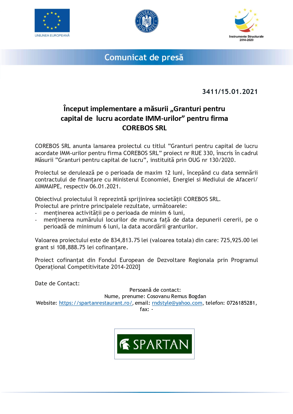 COREBOS SRL anunta lansarea proiectul cu titlul ”Granturi pentru capital de lucru acordate IMM-urilor pentru firma COREBOS SRL” proiect nr RUE 330, înscris în cadrul Măsurii ”Granturi pentru capital de lucru”, instituită prin OUG nr 130/2020.