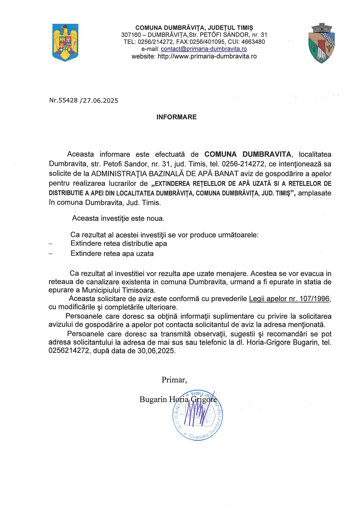 Persoanele care doresc sa obțină informații suplimentare cu privire la solicitarea avizului de gospodărire a apelor pot contacta solicitantul de aviz la adresa menţionată.