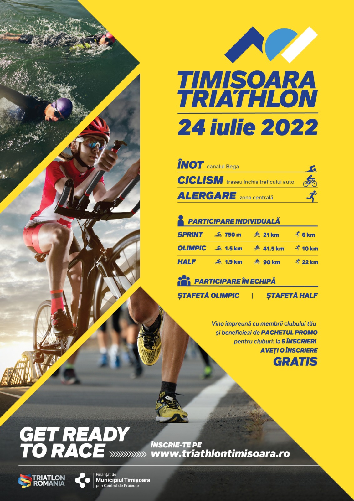 Pe distanțele OLIMPIC și HALF se poate participa și în echipe de 2-3 concurenți sub forma de ștafetă.
