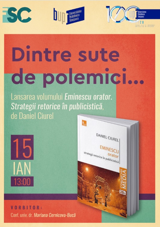 Sub titlul „Dintre sute de polemici…”, în data de 15 ianuarie 2020, la ora 13.00, în Sala Polivalentă a BCUPT va avea loc lansarea volumului „Eminescu orator. Strategii retorice în publicistică”, al cărui autor este Daniel Ciurel, cadru didactic al Facultății de Științe ale Comunicării din cadrul UPT. Volumul, apărut recent la editura Tritonic, prezintă publicistica eminesciană din perspectivă retorică și face parte din seria lansărilor de carte FSC.