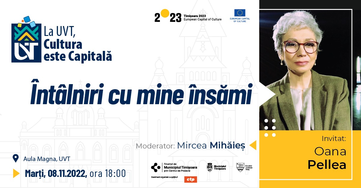 Tot marți, 8 noiembrie, însă de la ora 18:00, în Aula Magna, va conferenția Oana Pellea. Îndrăgita actriță de film și teatru ne propune o temă care ne invită la introspecție: „Întâlniri cu mine însămi”. Evenimentul va fi moderat de criticul literar Mircea Mihăieș.