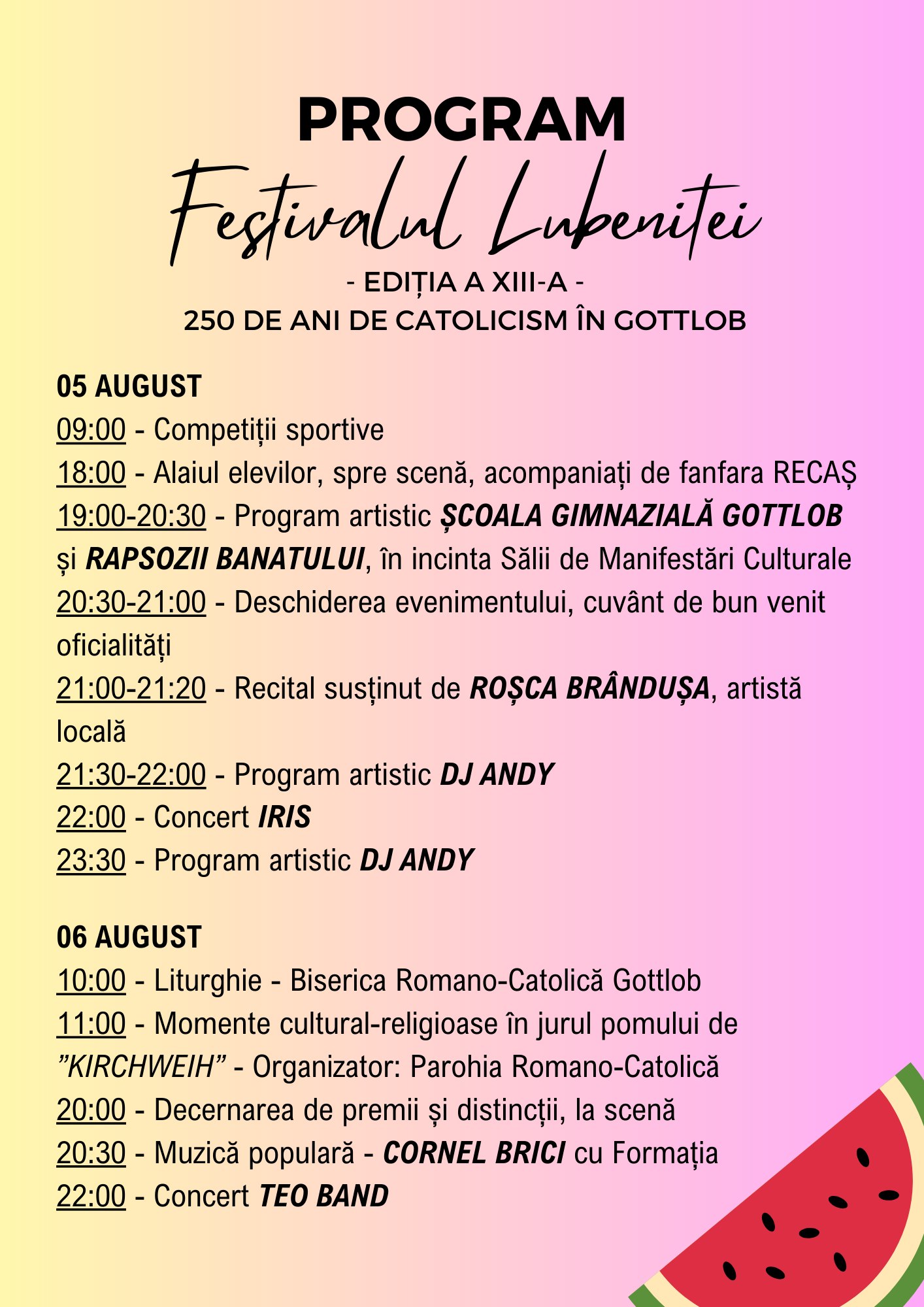 Festivalul Lubeniței din Gottlob și celebrarea a 250 de ani de catolicism a comunei vor avea loc în zilele de 5 și 6 august. Comuna timișeană este cunoscută la nivel național pentru producția de lubeniță, astfel că o asemenea manifestare nu avea cum să lipsească.