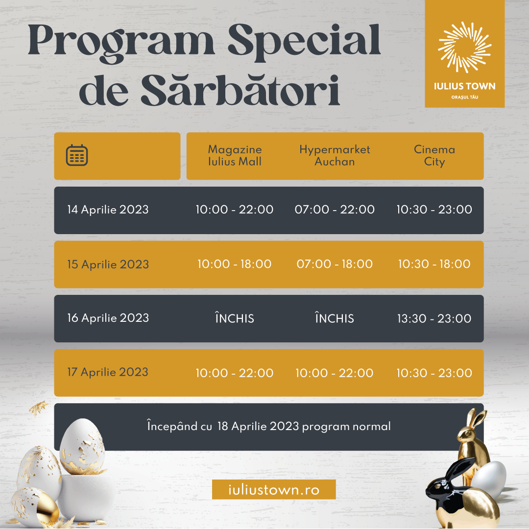 Dacă mai ai de făcut ultimele cumpărături pentru masa de Paște și trebuie să mai iei câteva cadouri, atunci cu siguranță trebuie să știi că ansamblul Iulius Town este deschis vineri, 14 aprilie, conform programului normal, 10.00 – 22.00, iar sâmbătă, de la ora 10.00 până la 18.00. În prima zi de Paște cu toții suntem alături de cei dragi, iar mall-ul este închis, cu excepția Cinema City, dar de luni, 17 aprilie, programul revine la normal.