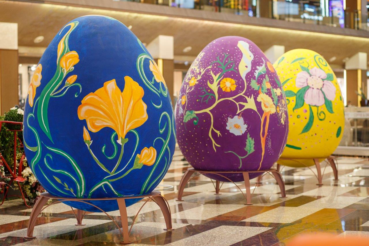 În același timp, curioșii pot admira cele trei ouă gigant, cu dimensiuni de 2 m, „încondeiate” manual de elevii de la Liceul de Arte Plastice și Liceul „Ion Vidu”. Cele trei proiecte au fost coordonate de artistul vizual Horațiu Cristian Pavelescu și sunt expuse în Atrium, până pe 21 aprilie. Formatul atipic i-a îndemnat pe elevi să experimenteze tehnici cunoscute și să lase culorile să prindă viață, iar elementele de art-nouveau sunt temele principale ce se regăsesc pe cele trei ouă.