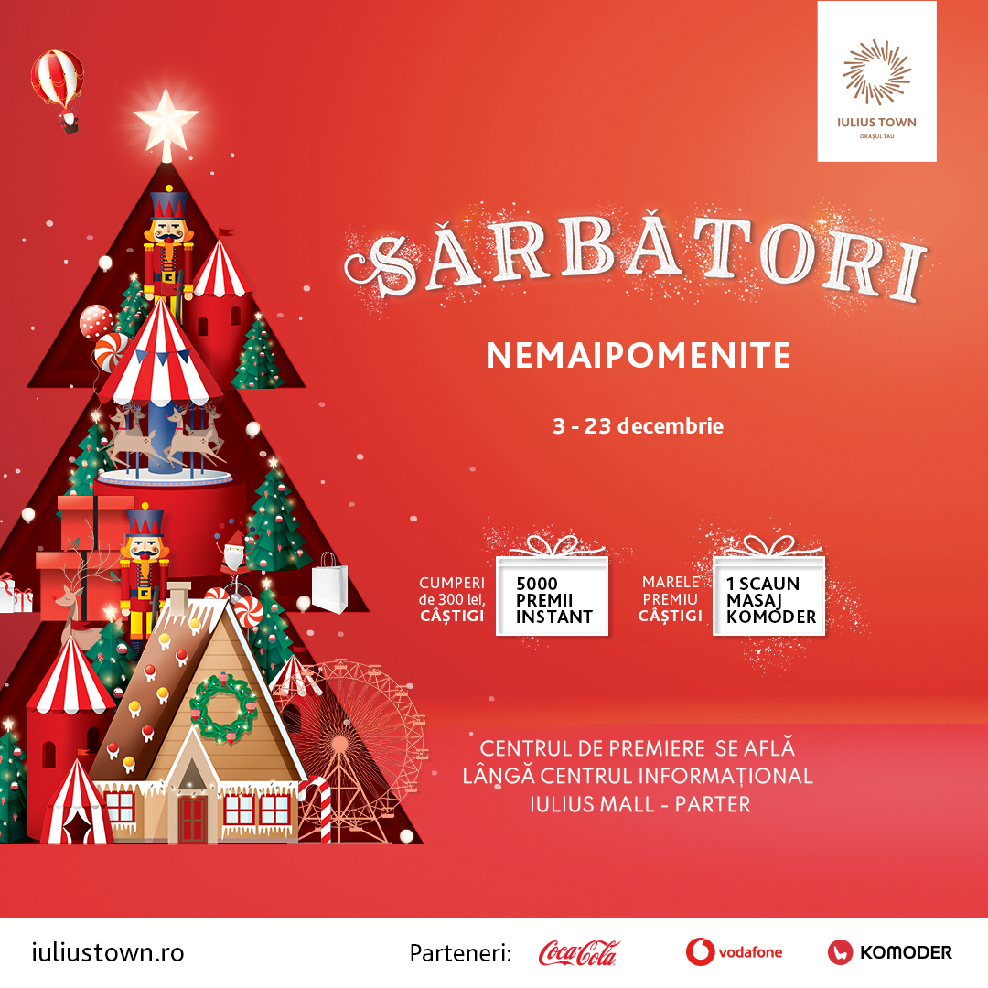 „Sărbători Nemaipomenite”, cu dulciuri, cadouri sub brad și premii atractive, din partea Iulius Town! Până pe 23 decembrie 2021, ai șansa de a câștiga unul dintre cele 5.000 de premii instant: cecuri cadou și vouchere cu valori de până la 100 de lei pentru sesiuni de shopping la magazinele din Iulius Mall, băuturi răcoritoare, ursuleți de pluș sau bilete la Roata Panoramică, pentru a vedea orașul de sus! Pentru a putea câștiga aceste premii, trebuie să faci cumpărături în valoare totală de minim 300 de lei din Iulius Mall și să te prezinți, în aceeași zi, la Centrul de Premiere situat în zona Centrului Informațional din Iulius Town, unde vei învârti Roata Cadourilor, în variantă digitală.