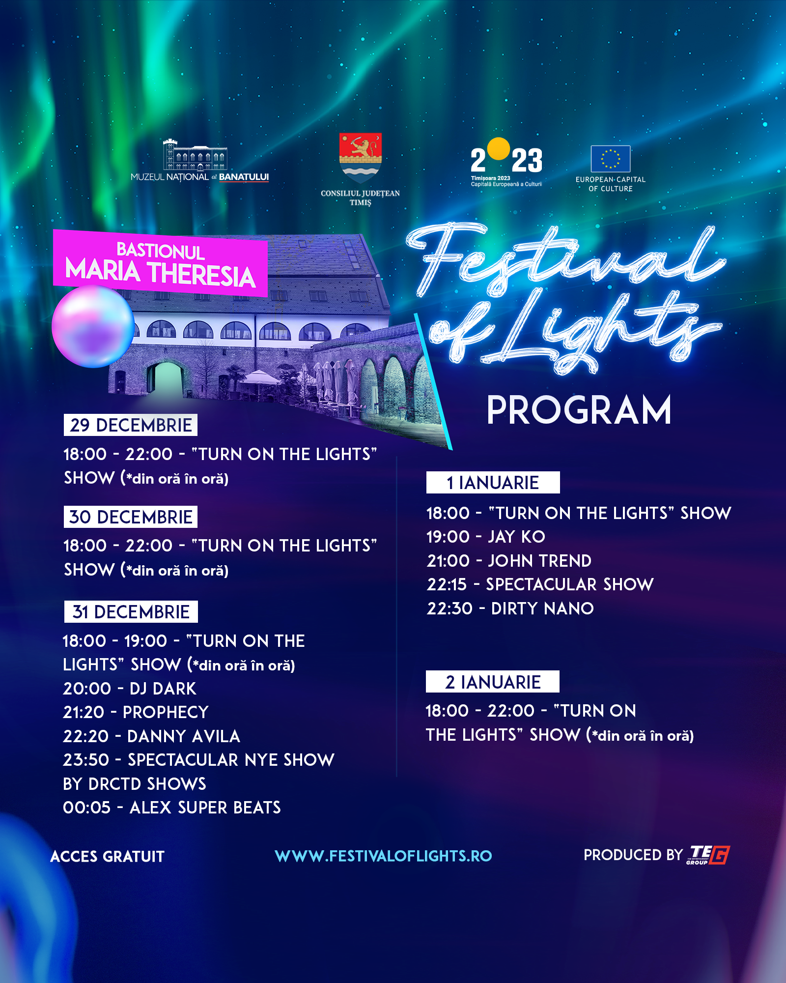Festival of Lights face parte din Programul cultural al Timișoarei – Capitală Europeană a Culturii. Evenimentul este finanțat de Consiliul Județean Timiș, organizat de Muzeul Banatului și implementat de echipa The Entertainment Group.