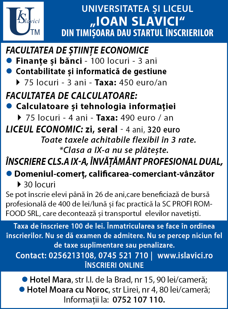Universitatea Ioan Slavici o găsiți pe Str. Păunescu Podeanu Nr. 144, în Timișoara. Telefon:+40 (256) 213 108Tel: +40 (745) 521 710. Email: secretariat@islavici.ro. www.islavici.ro.