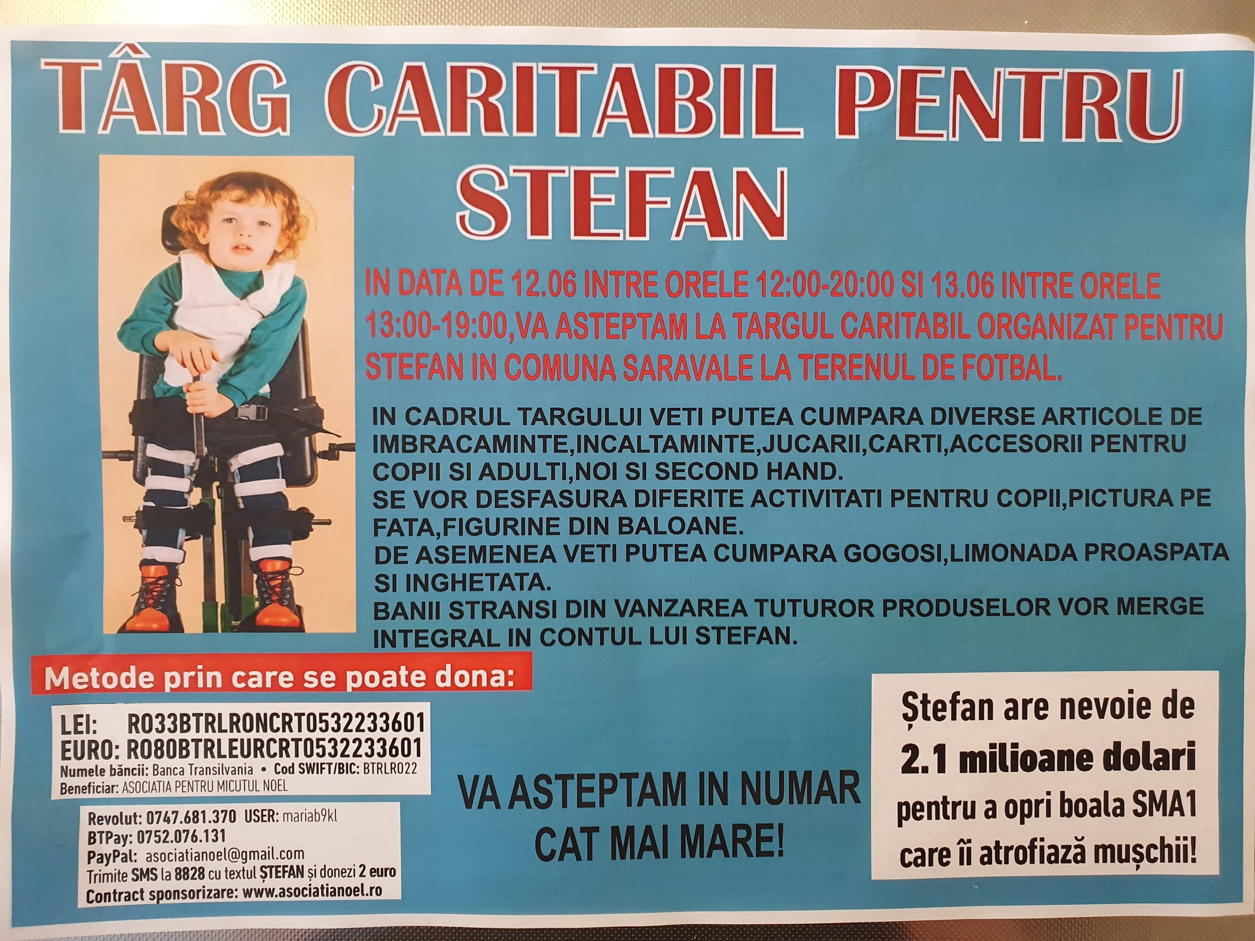 Târgul caritabil va avea loc pe terenul de fotbal de la Saravale, timp de două zile – sâmbătă, 12 iunie, între orele 12 – 20, respectiv duminică, 13 iunie, între orele 13 – 19. Organizatorii au strâns donații – haine, încălțăminte, jucării, diverse accesorii pentru adulți și copii – pe care le pun la vânzare. Banii strânși vor ajunge în contul copilului care suferă de amiotrofie musculară spinală SMA1.