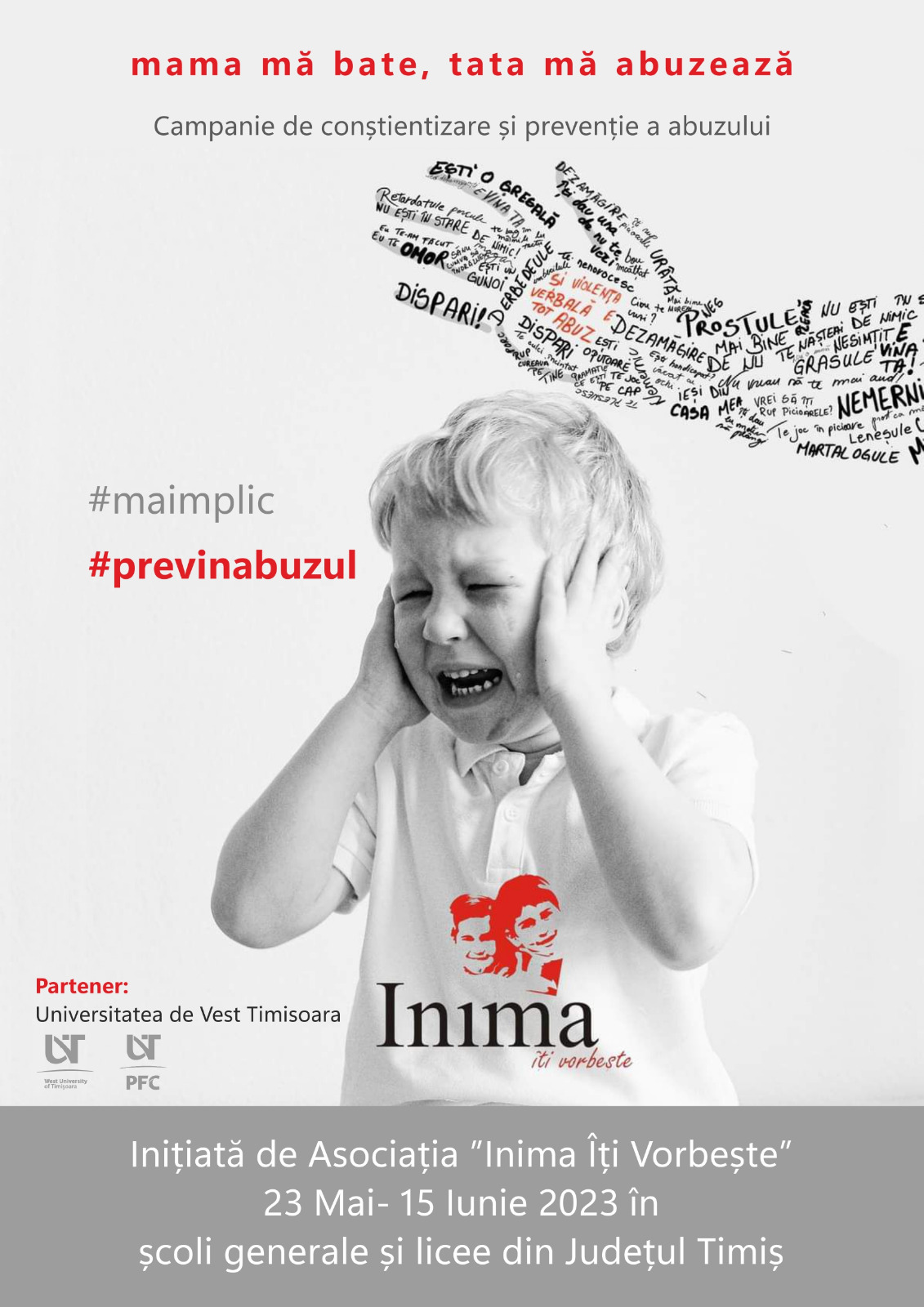 În cadrul campaniei „Mama mă bate, tata mă abuzează. Ajută-mă, te rog!”, desfășurată între 23 mai și 15 iunie, reprezentanții Asociației „Inima Îți Vorbește” și studenții de la PFC se vor deplasa în mai multe școli și licee din Timișoara și din județ pentru a le explica pe larg elevilor ce înseamnă cu adevărat abuzul și care sunt urmările acestuia. Aceștia țin să organizeze campania în jurul a patru teme principale: