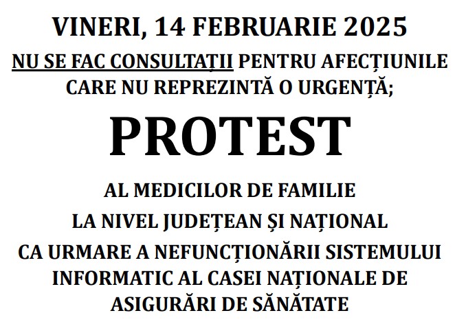 Patronatul Medicilor de Familie din Timiș, care are 200 de membri, a anunțat că, în semn de protest, vineri, 14 februarie, nu vor fi efectuate consultații pentru afecțiuni care nu reprezintă urgențe.