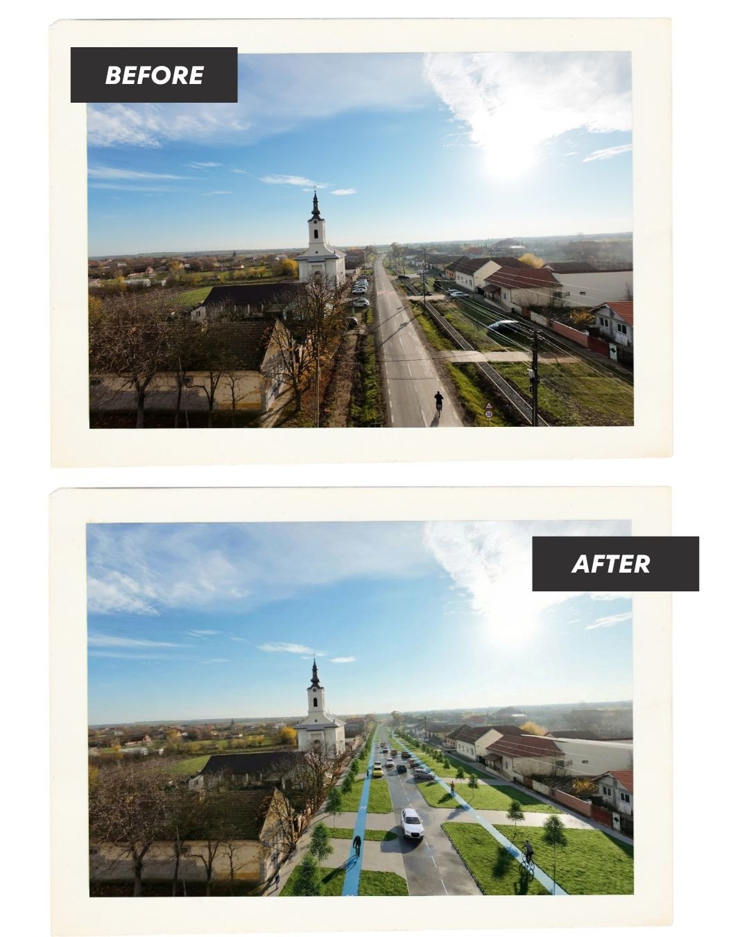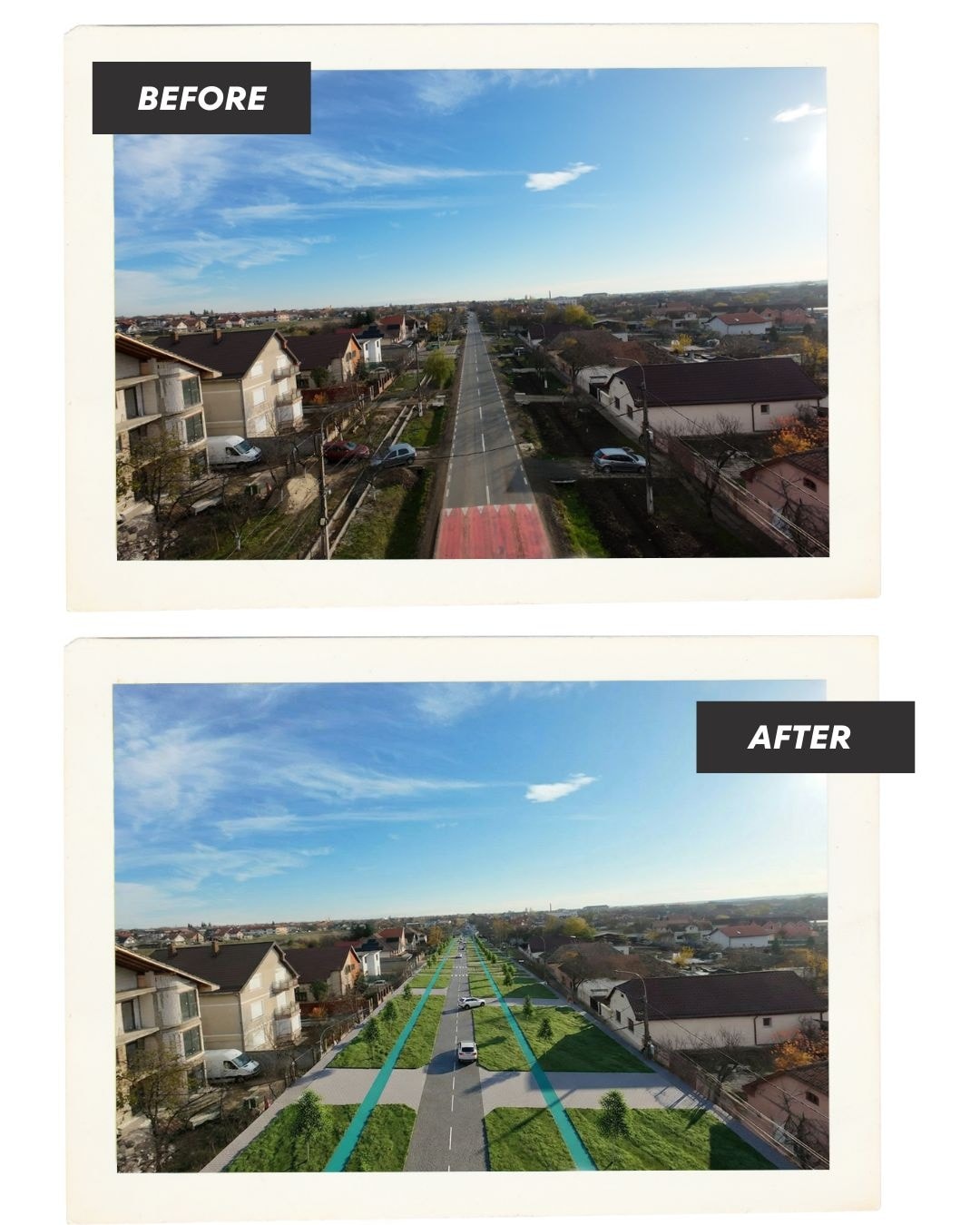 Pentru a evidenția beneficiile investiției, autoritățile au prezentat exemple de străzi „înainte” și „după” finalizarea lucrărilor. Odată cu amenajarea pistelor de biciclete, șanțurile existente vor fi introduse în subteran, iar trotuarele și accesurile către proprietăți vor fi complet modernizate.