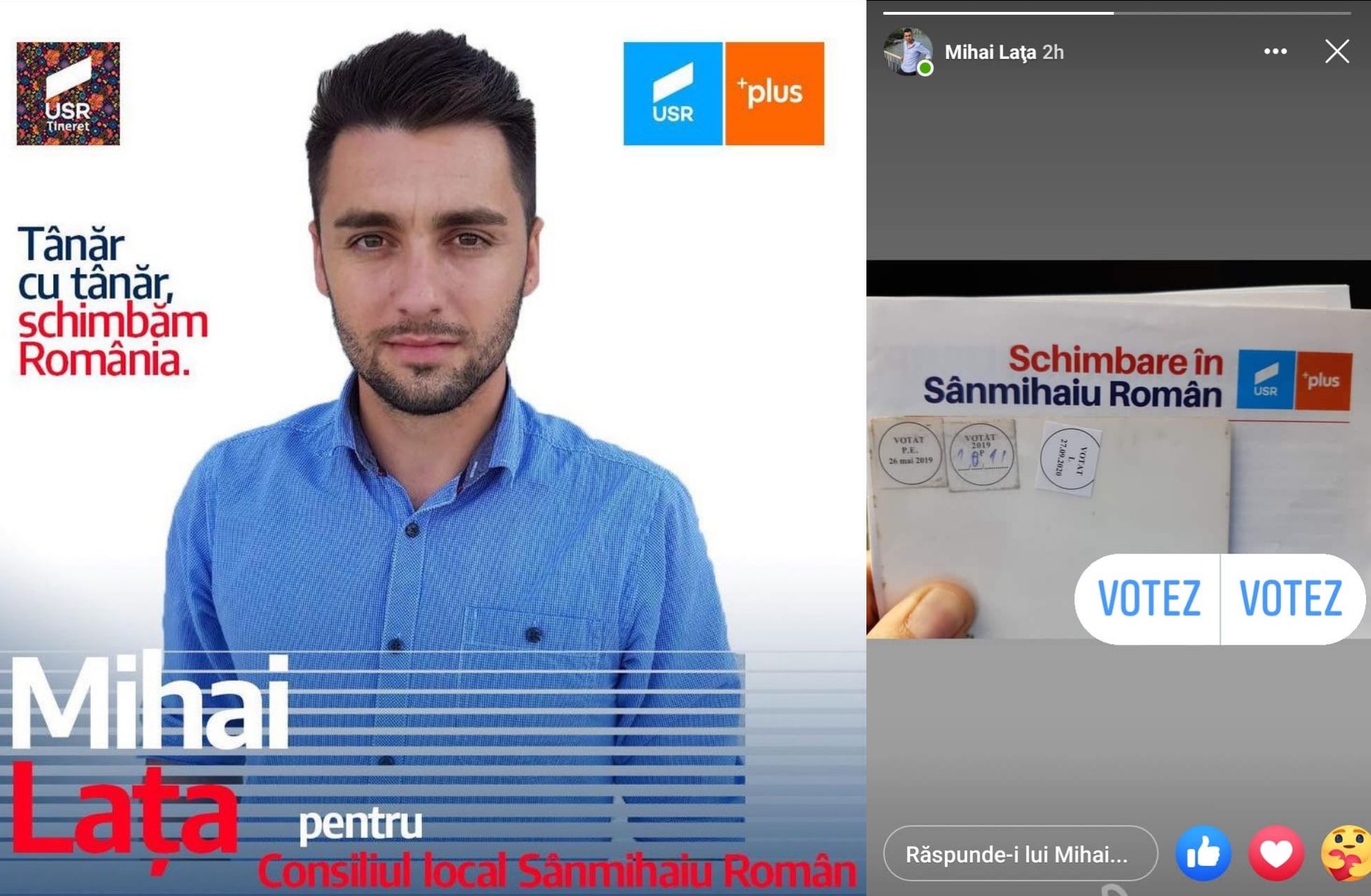 Un candidat USR-PLUS pentru Consiliul Local Sânmihaiu Român, Mihai Lața, își face campanie pe Facebook chiar în ziua votului. Un reprezentant liberal a surprins o captură de ecran cu „povestea” candidatului pe Facebook.