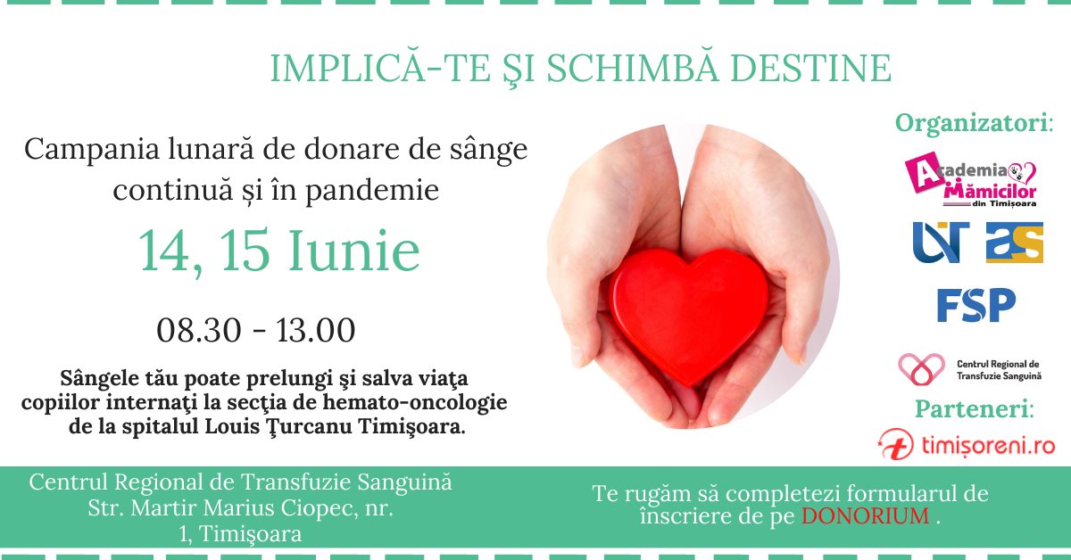 Este nevoie de sânge și pentru copiii internaţi la Secţia de hemato-oncologie a Spitalului Clinic de Urgență pentru Copii „Louis Ţurcanu” din Timişoara. Asociaţia „Academia Mămicilor din Timișoara” (AMT) continuă proiectul „Implică-te şi schimbă destine – donează sânge”. Sunteți chemați să donați sânge pe 14 iunie, de Ziua Mondială a Donatorului de Sânge, și pe 15 iunie.