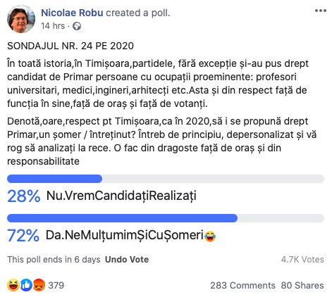 Nicolae Robu a lansat deja sondajul cu nr. 24 pe rețeaua de socializare. Le explică fanilor încă neblocați pe Facebook cum în Timișoara au candidat la primărie doar „persoane cu ocupații proeminente”, nu „șomeri/ întreținuți”. Robu face referire la principalul său contracandidat, Dominic Samuel Fritz, un neamț stabilit în România care a lucrat, până nu demult, alături de președintele Germaniei. Fritz a renunțat la viața de peste hotare și s-a mutat în Timișoara, unde țintește, din partea USR, postul de primar.
