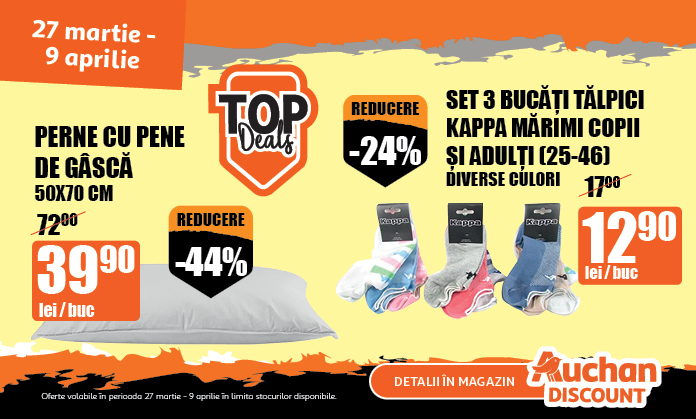 De asemenea, până pe 9 aprilie, ai 44% reducere la pernele cu pene de gâscă și 24% reducere la setul de 3 bucăți de tălpici Kappa pentru copii și adulți.