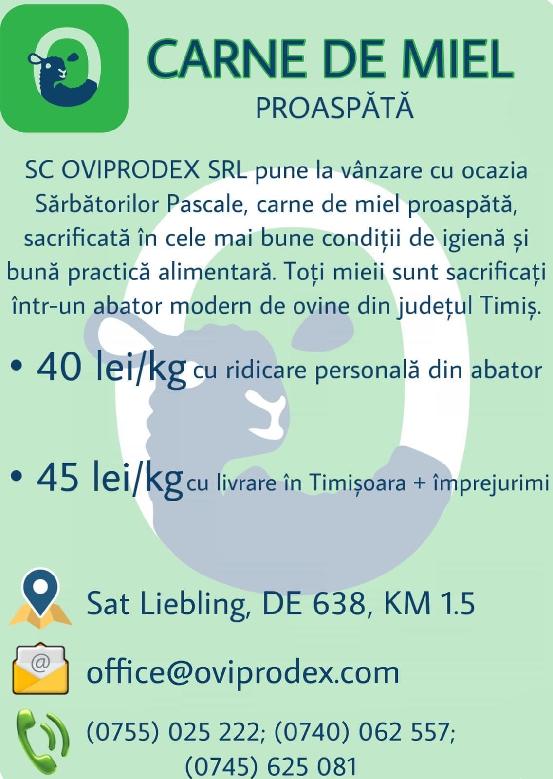 SC OVIPRODEX SRL, din Liebling, pune la vânzare, cu ocazia Paștelui, carne de miel proaspătă, sacrificată în cele mai bune condiții de igienă și bună practică alimentară.