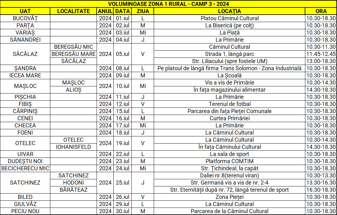 Cetățenii din localitățile menționate mai sus pot depune prin aport voluntar și gratuit deșeurile voluminoase în containerele special puse la dispoziție în punctele de colectare și între orele menționate în tabelul de mai jos.