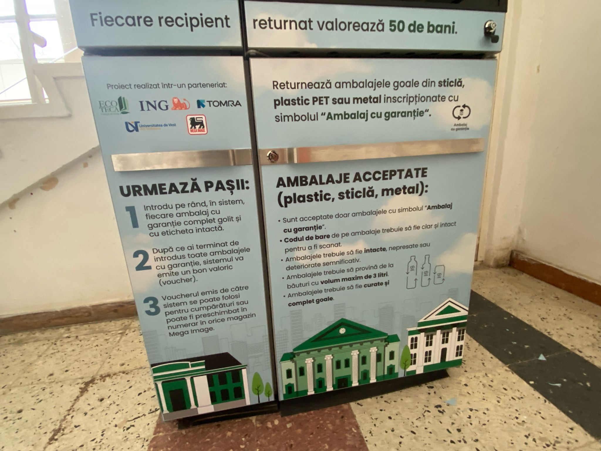 Sistemul automat de preluare a ambalajelor este instalat la parterul sediului central al UVT (str. Vasile Pârvan, nr. 4) și le permite studenților să returneze ambalajele de băuturi în schimbul voucherelor valorice, care pot fi utilizate pentru cumpărături sau schimbate în numerar în orice magazin Mega Image.